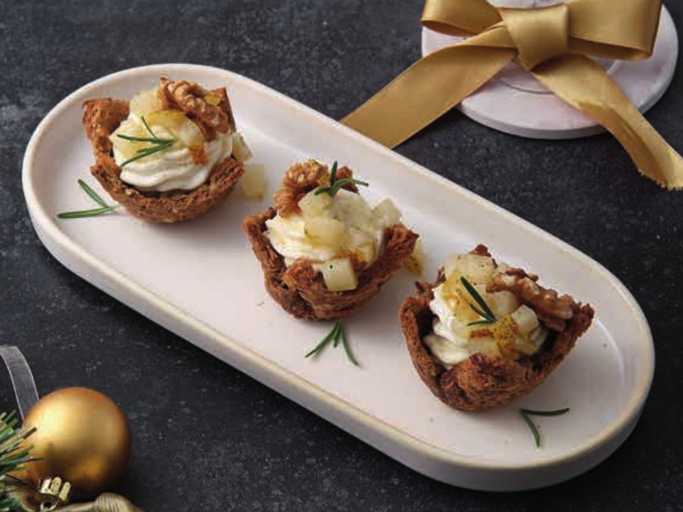 Assemble: Use a piping bag to pipe the cream into the baskets and garnish with a spoonful of pears, a walnut kernel, a drizzle of honey, and the rosemary. I recommend filling your bread baskets just before serving.