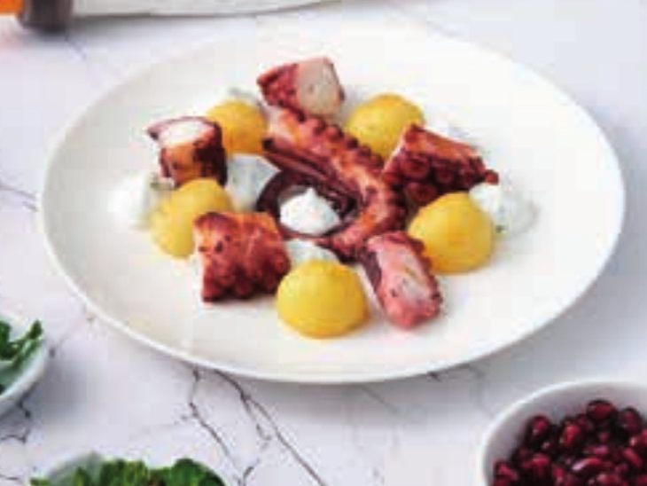Insalata di polpo e patate con yogurt alle erbe e melagrana.
