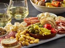 A traditional Tuscan antipasto platter features a variety of cured meats, local cheeses, crostini, and marinated vegetables, emphasizing the rustic, local flavors of the region.