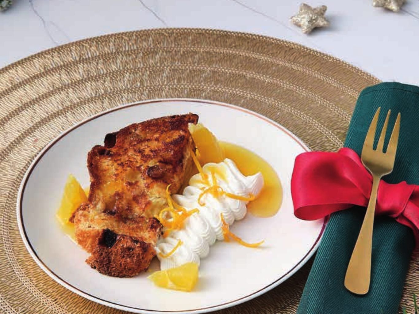 Plating. Arrange one or two caramelised panettone segments on the plate,