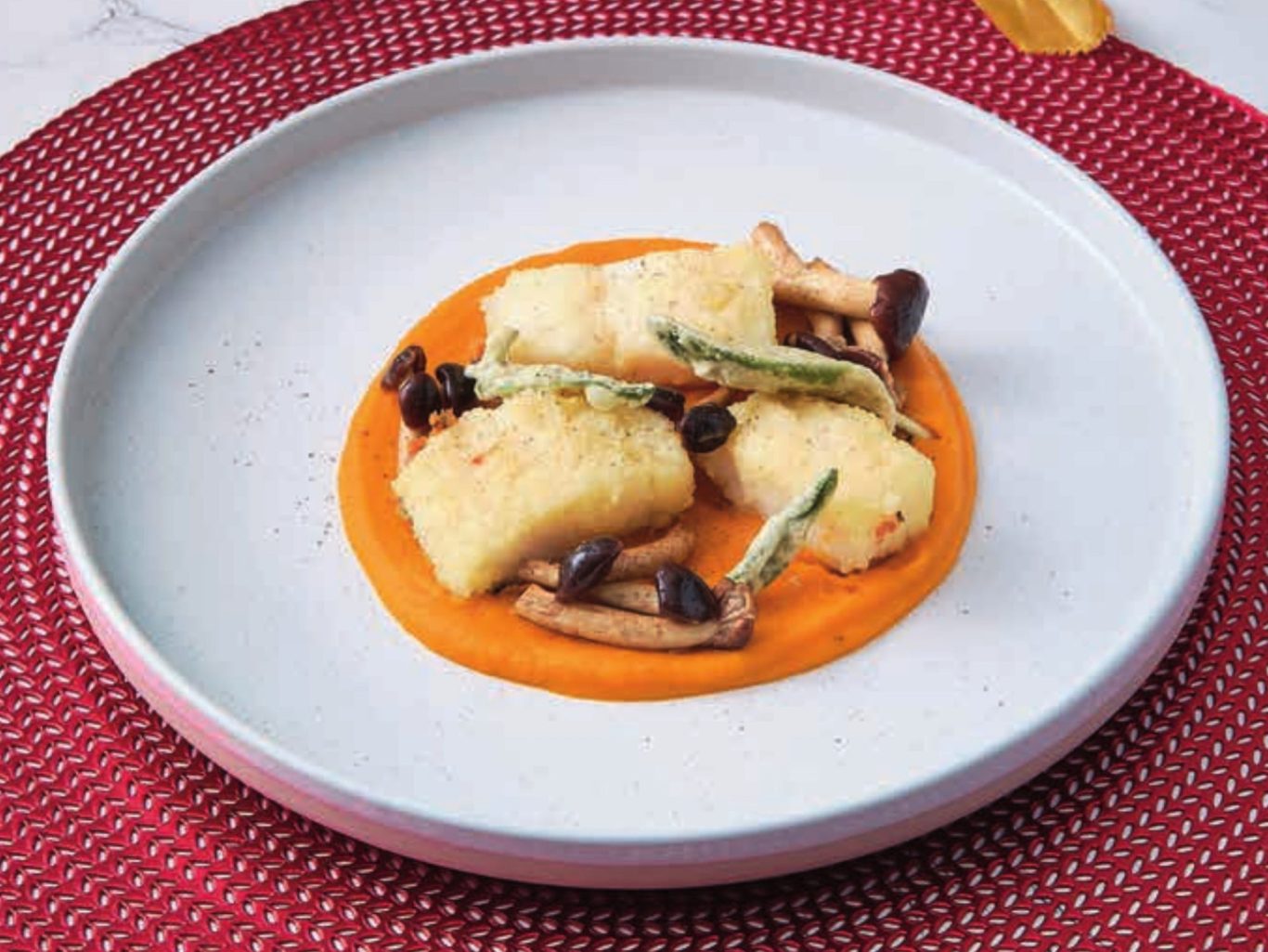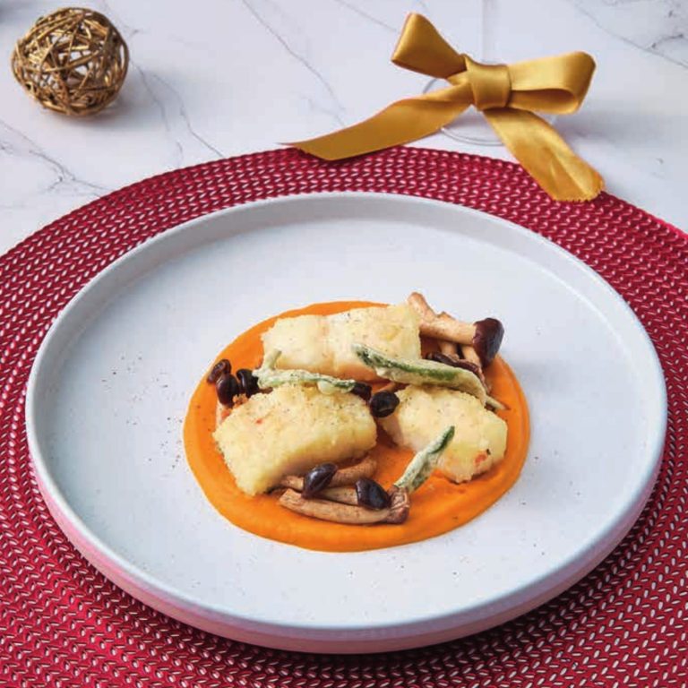Filetto di baccalà gratinato, crema di zucca e chiodini.